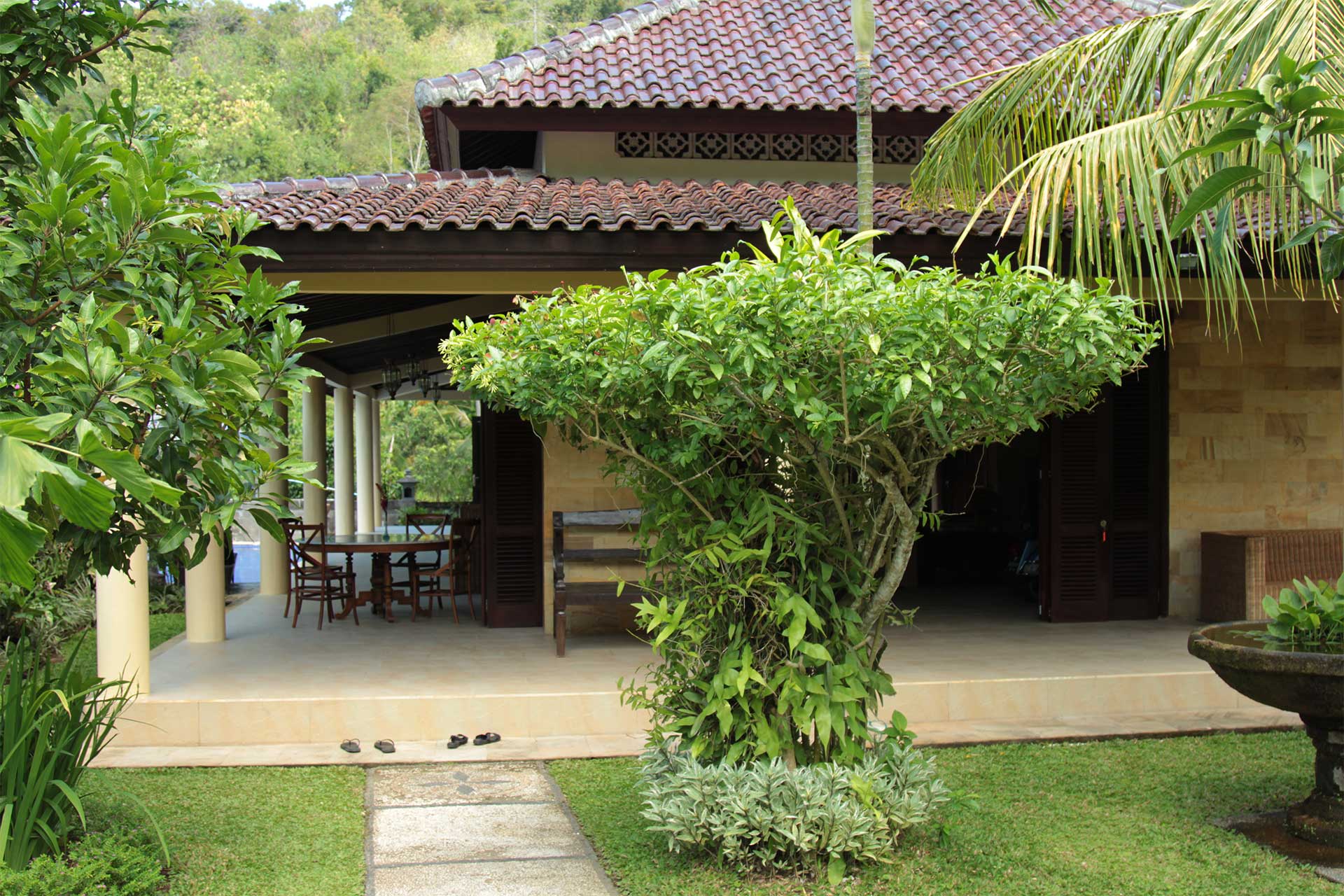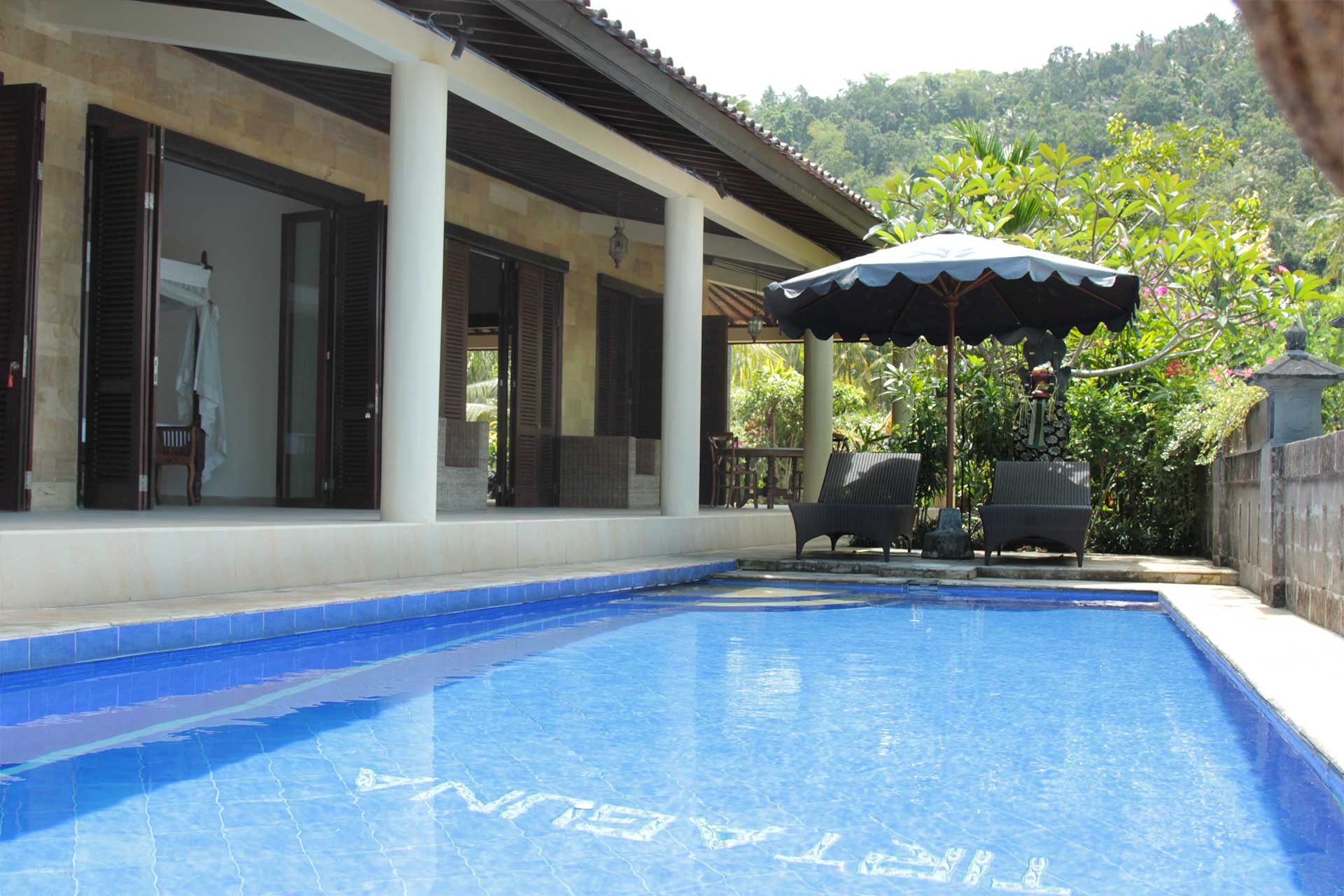 The house has a spacious 20 meters wide veranda in front of the villa from where you have a stunning view over the rice fields , the hills and the coconut plantations. Attached to the veranda there is a lovely cobalt blue tiled swimming pool . The tropical garden that surrounds the house is a place of peace and tranquillity and offers from each corner of the garden a great view over the landscape . The garden has a traditional Balinese gate and is bordered by a low stone wall , designed to maximise the view over the rice fields.